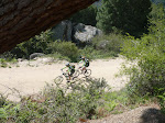 El camino de vuelta lo hicimos por el mismo que habíamos ido, no sin antes despistarnos un poco y dar una vuelta hasta encontrar el camino de regreso. Todo transcurrió sin novedad y a buen ritmo hasta que volvimos a pasar el riachuelo donde Juanra había metido el pie. Kike, Miguel y yo decidimos bajarnos de nuestras monturas y pasar andando por el paso que hay para tal efecto. Pero Juanra y Rebo no…. Y esta vez le tocó al más veterano meter la pata, nunca mejor dicho, metiendo un pie en el agua (y Rebo no lleva bota impermeable…).